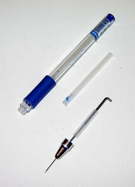 Заталкиваем иглу со стрежнем внутрь корпуса ручки, прикручиваем внизу, как должно быть.